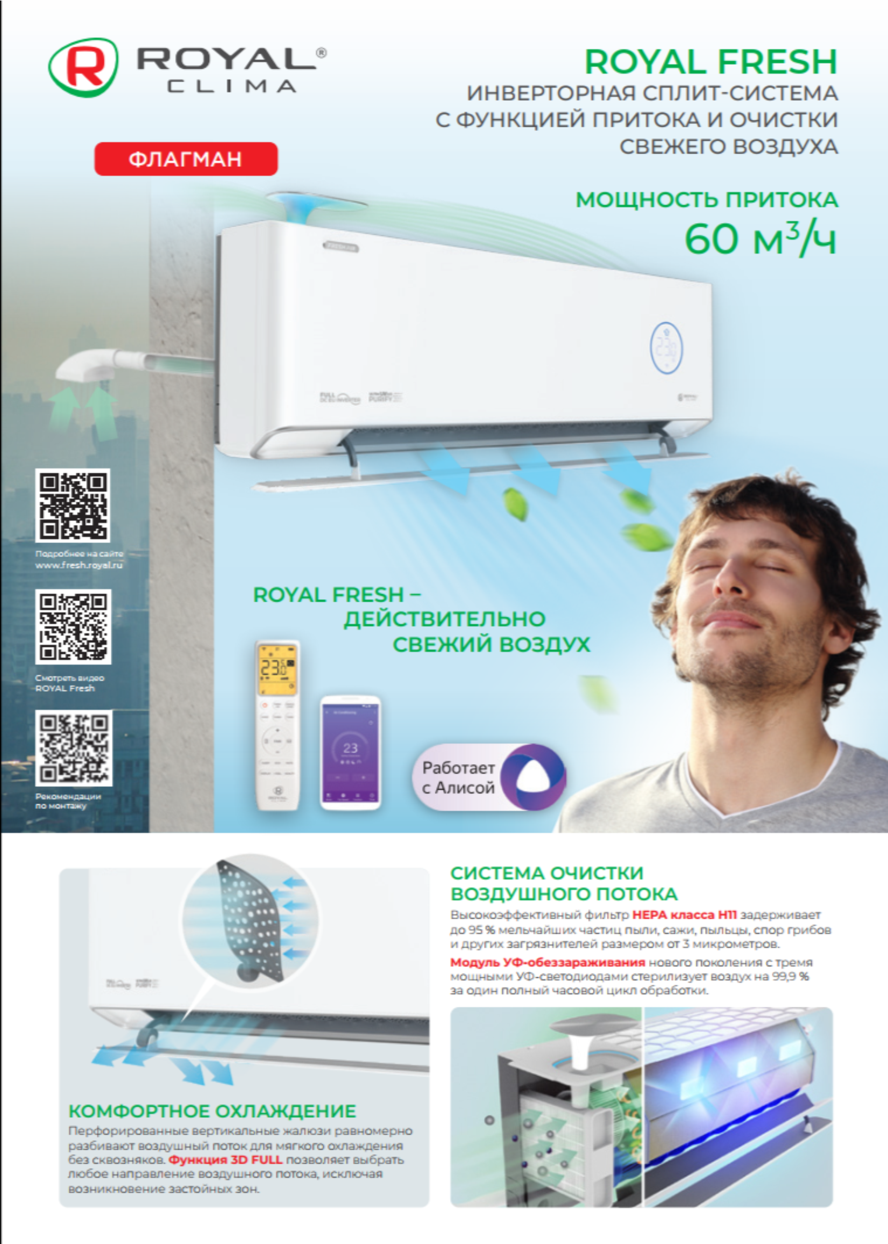 Сплит-система ROYAL FRESH оснащена функцией притока свежего воздуха с улицы в объеме до 60 м3/час. Этого достаточно для 2 человек*, постоянно находящихся в помещении площадью более 20 м2. Очищенный, насыщенный кислородом воздух требуемой температуры поступает в помещение, даже когда на улице -15 °С.